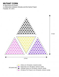 The three outer triangles will each be planted with different, brightly colored corn: red, blue, pink. In the center triangle, we will plant a commercially produced genetically modified maize (GMM). This will be a pale yellow or white corn. This central corn will be our neutral test subject, growing ears that will display a mosaic of color reflecting the genetic influence of its neighbors. Unlike the rest of the corn, it will be de-tasseled (stripped of its pollen producing flowers) to prevent both cross- and self-pollination.