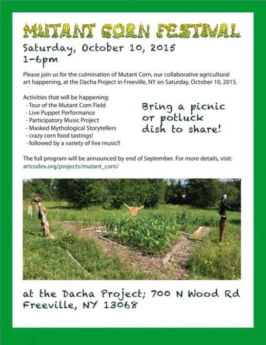 For the summer of 2015 the Dacha Project (Freeville, NY) and artCodex (Brooklyn, NY) have teamed up to lay the framework for a project that will gather a community to discuss corn in all of its natural beauty, as well as the many problematic issues that surround it.